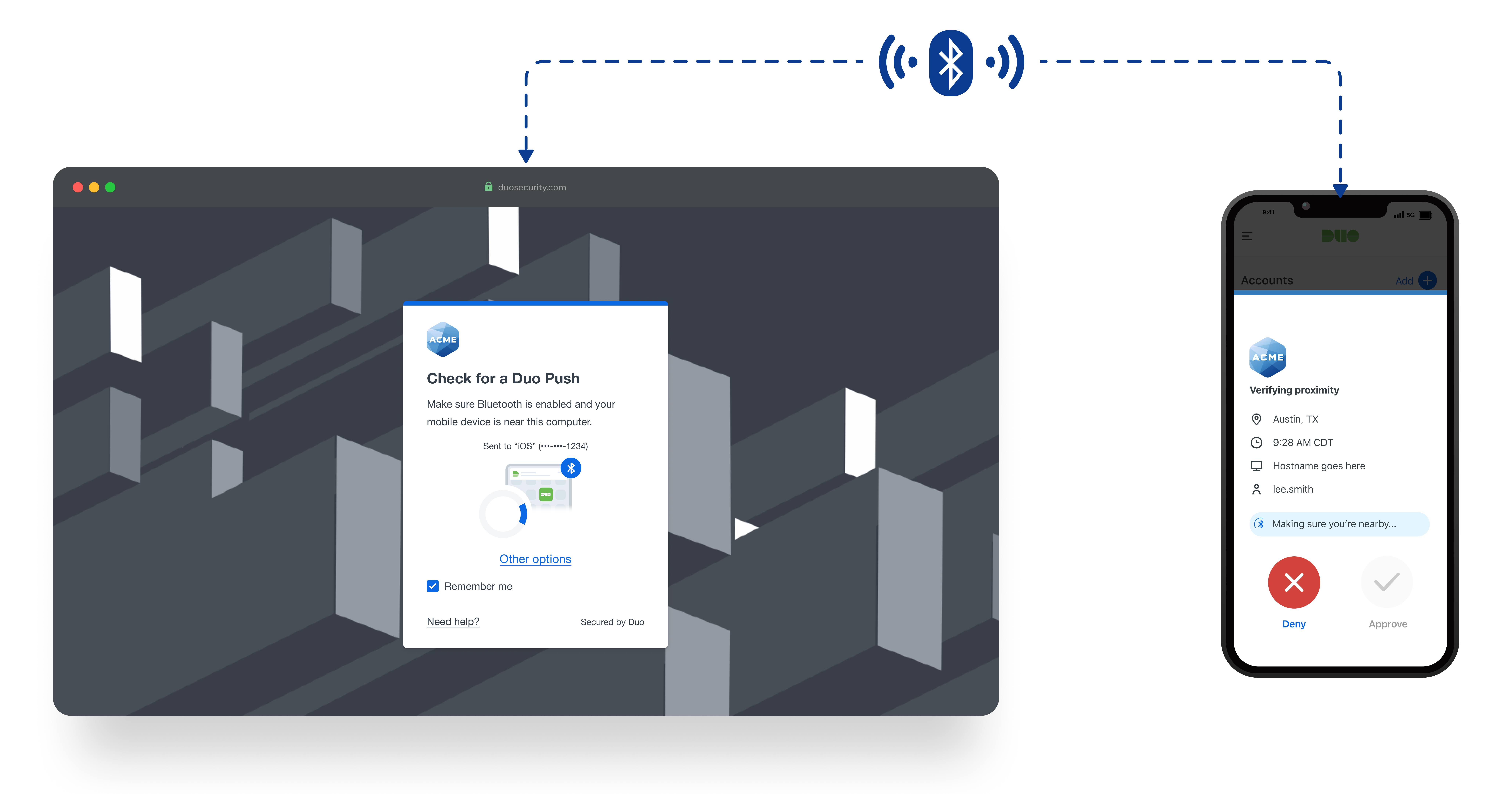 Bluetooth Duo Push is an enhanced authentication method that uses Bluetooth technology to confirm a user’s phone is physically near their computer during login. It builds on the familiar Duo Push experience and adds a layer of security behind the scenes without adding friction for the user.
