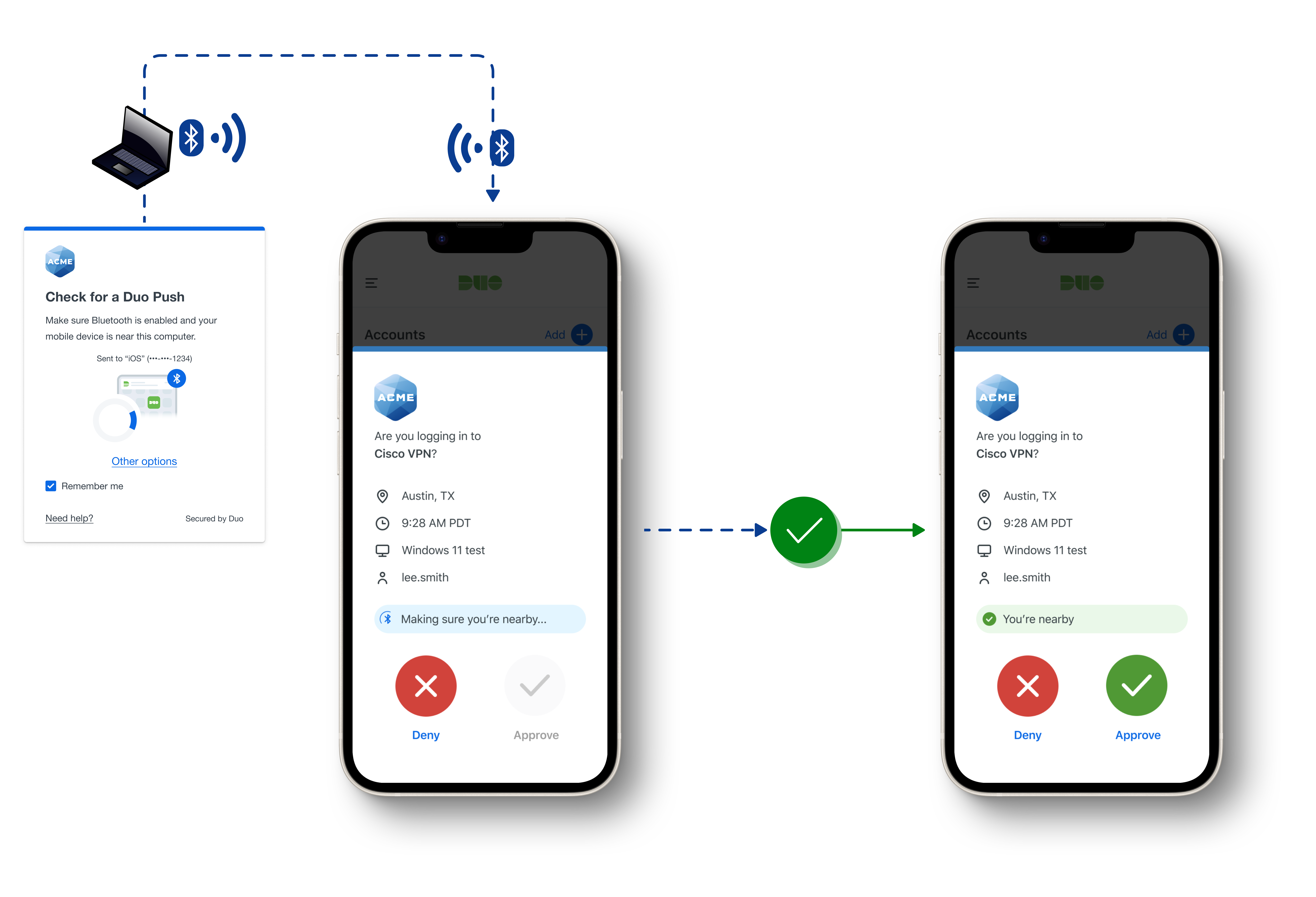 The existing Verified Duo Push experience was enhanced by adding a Bluetooth-based proximity check, accompanied by a visual spinner that indicates the system is verifying nearby devices. Checking for device proximity through Bluetooth adds an extra layer of security while enhancing the overall user experience by making authentication smoother and more seamless, helping increase our Verified Push adoption rates while maintaining stronger security than regular Duo Push.