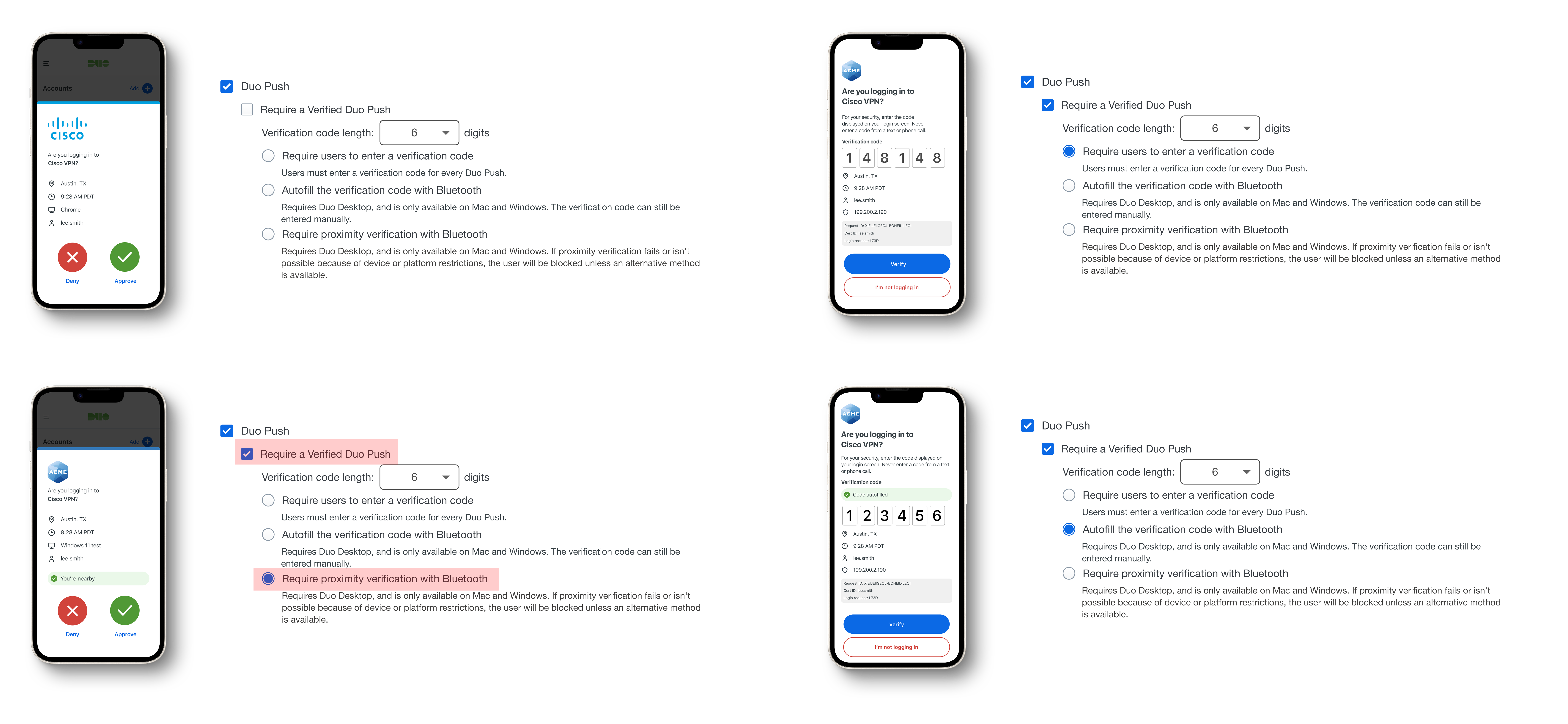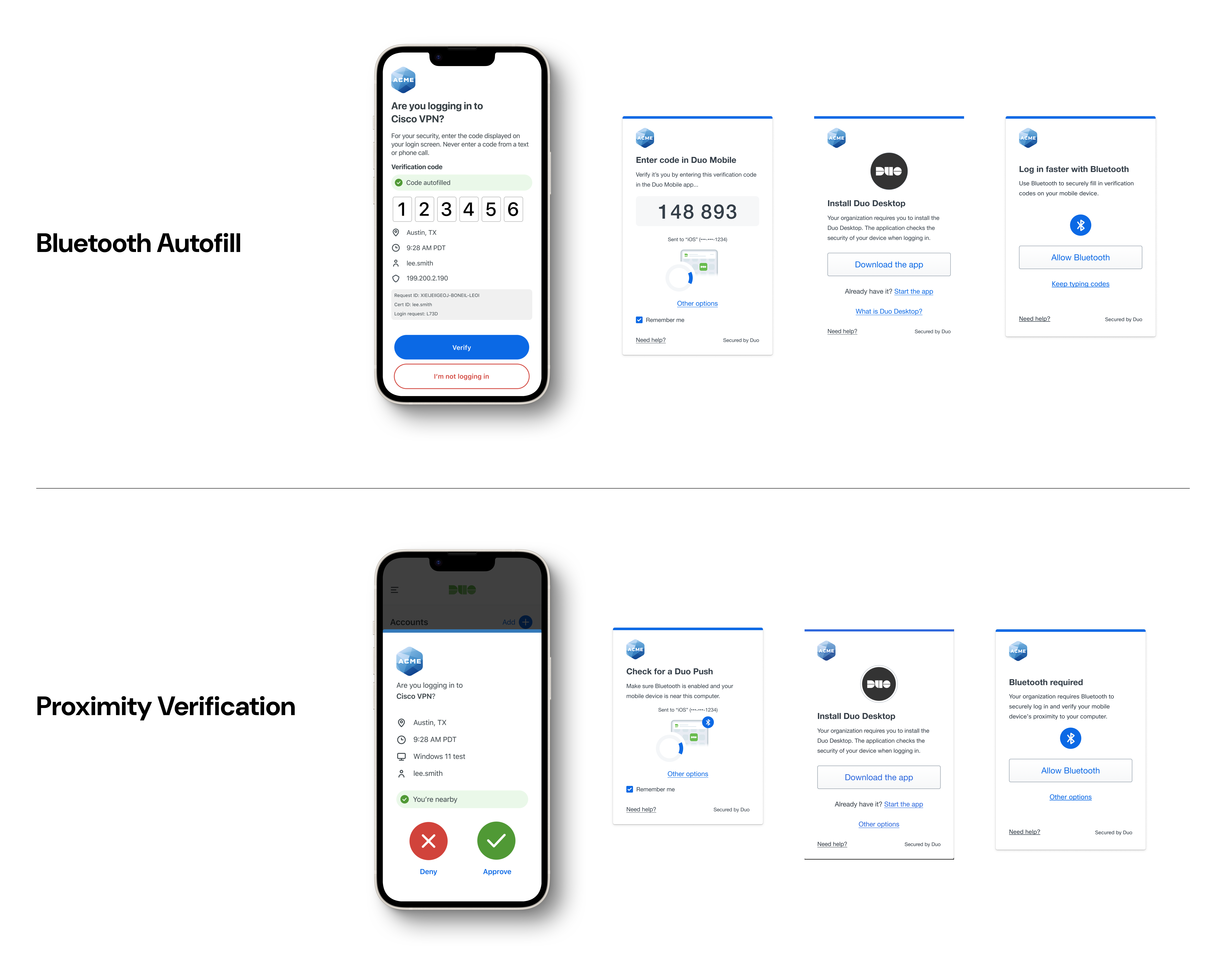 Proximity Verification can block users from moving forward, unlike Bluetooth Autofill, so we made small adjustments to existing prompt screens to offer alternative authentication methods. We also added Bluetooth indicators to illustrations and updated content on both device prompts and the Duo Mobile app to enhance clarity.